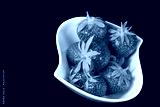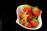 Fresh strawberries in white bowl on a black background.