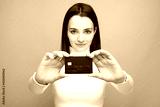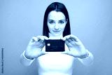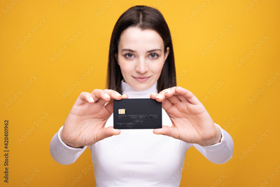 Close up portrait of young smiling business woman holding credit card, isolated on yellow background.