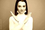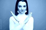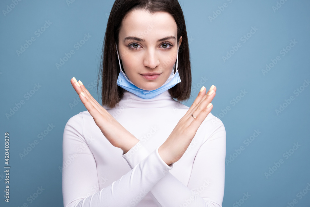 A young girl put on a medical mask incorrectly. The woman shows an error while wearing a mask.