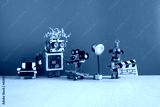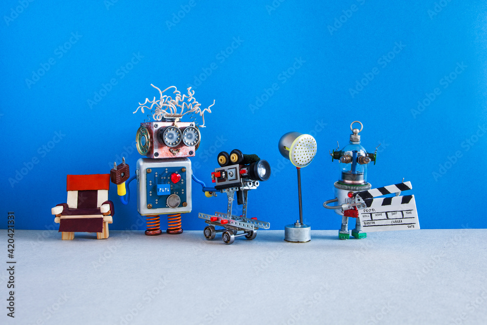 Robot cameraman and assistant shoots motion picture television episode or movie. Funny robotic filmmaker operator with retro camera, director chair and spotlight behind the scenes. Blue background