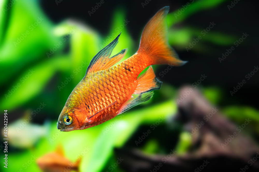 Tropical aquarium fish longtail barb Pethia Conchonius. Shallow depth of field.