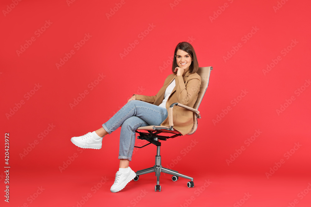 Young woman sitting in comfortable office chair on red background