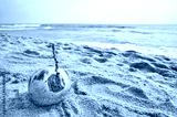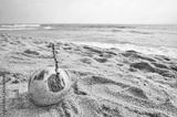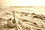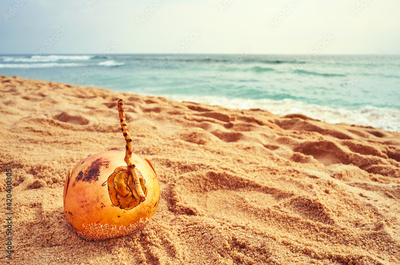Coconut on a tropical beach, selective focus, color toning applied.