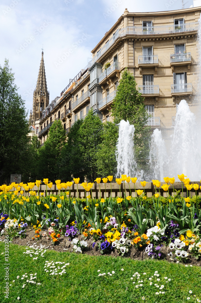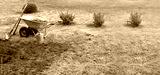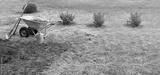 patch of grass and dug up against the background of watering can, shovel, rake and garden wheelbarrow against the backdrop of a garden and a vegetable garden. break after processing the site