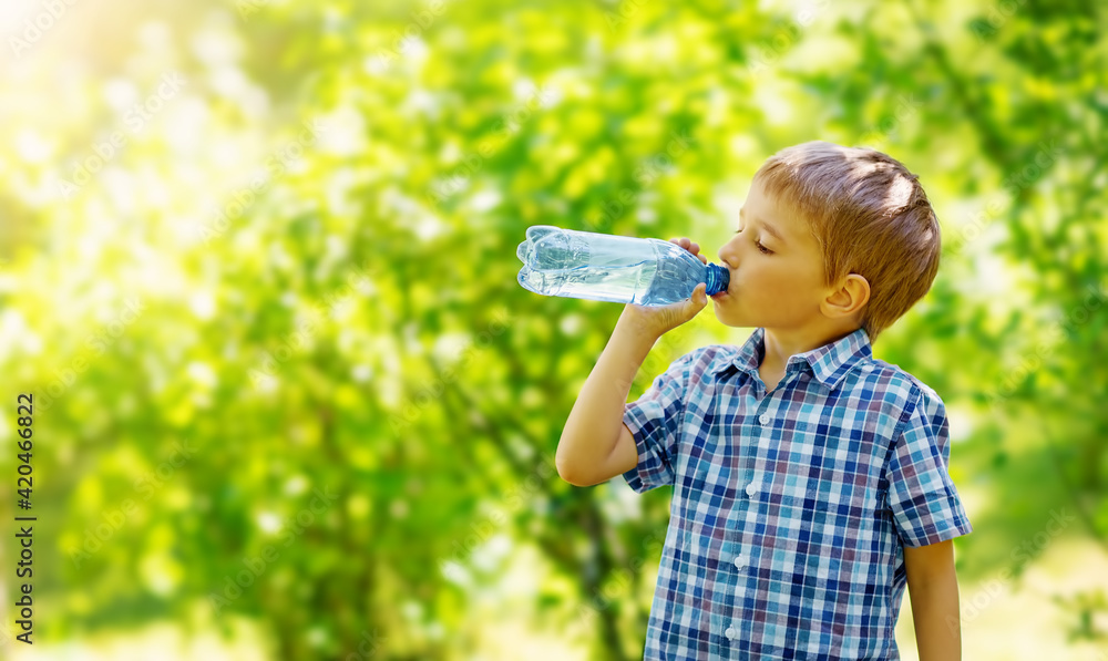 Cute boy drinking a bottle of pure water in nature.