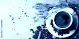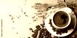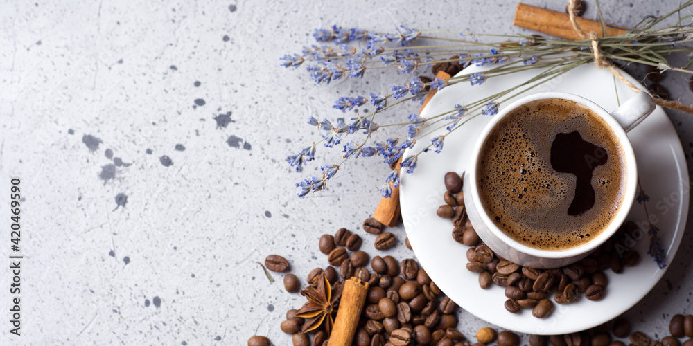 A cup of aromatic espresso coffee on a white table, a stick of cinnamon, anise, scattered roasted coffee beans, copy space banner