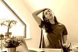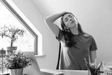 Beautiful women exercising at home office by stretching her neck. Healthy living and body care while at home.