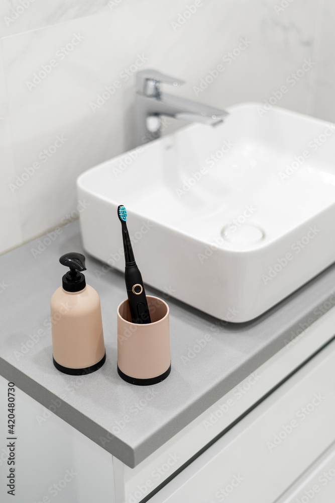 Electric toothbrush in cup and soap dispenser bottle near basin