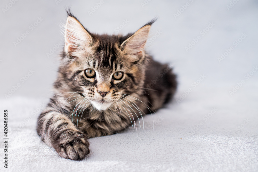 Maine Coon tabby kitten lies on light fluffy blanket