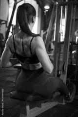 Vertical rear view shot of a sportswoman with muscular back exercising on gym machine