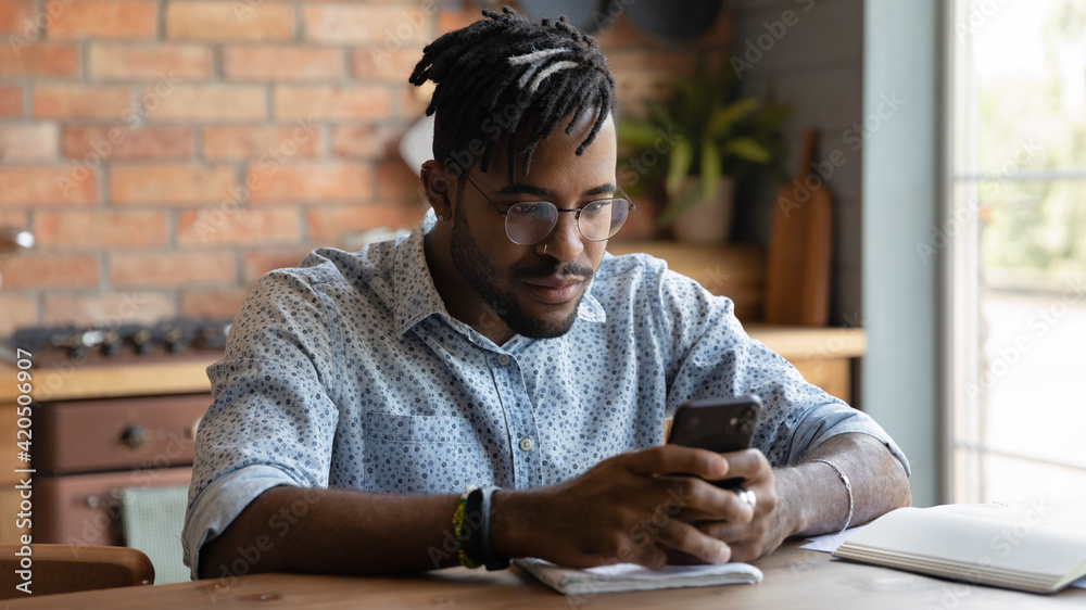 I will check internet. Interested african american male prepare home task looking for answer the question online browsing web using cell. Young black man student hipster watch education video on phone
