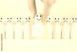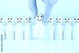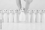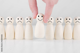Wooden man with icons showing emotions and scores. Excellent business rating. Concept of satisfaction survey and customer services experience.