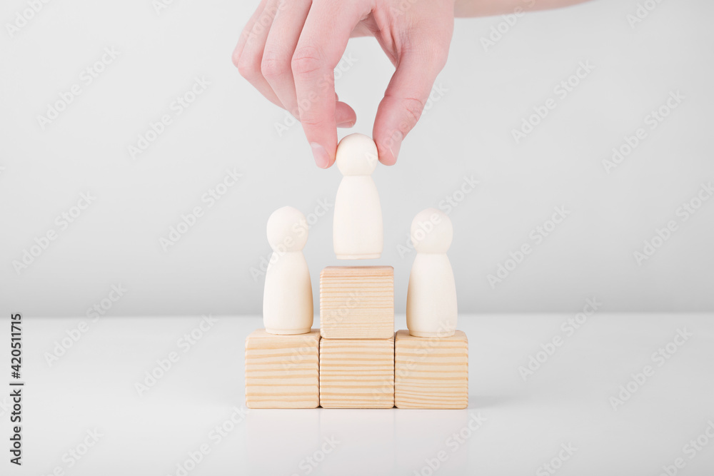 Businessman hold wooden man representing leader steps up success with standing on the pedestal. Concept of leadership and career growth.