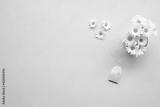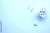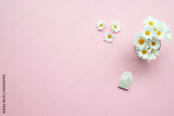 tea time, chamomile tea bag and fresh flowers on pink background. Top view.