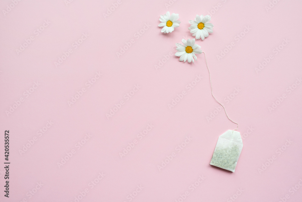 tea time, chamomile tea bag and fresh flowers on pink background. Top view.