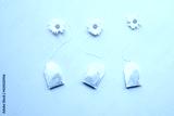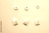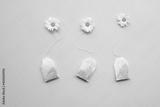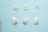 tea time, chamomile tea bag and fresh flowers on blue background. Top view.