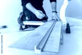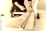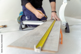 Close up shot of a carpenter measuring a wooden plank to do the installation of the floor