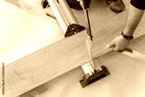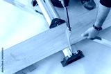 top view of a man cutting a sheet of wood with a guillotine for the installation of a wooden floor