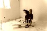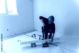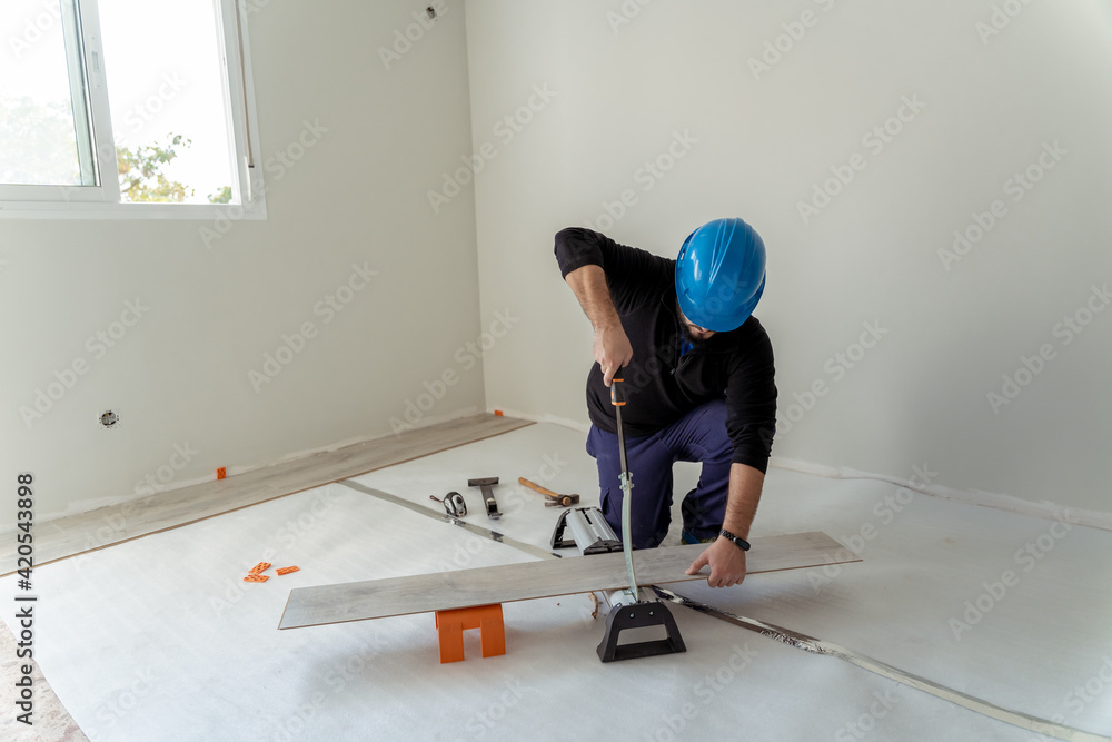 carpenter cutting a sheet of wood to install the flooring in a home renovation