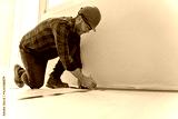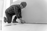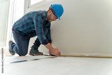 Builder man measuring for the installation of the wooden floor in the renovation of a house