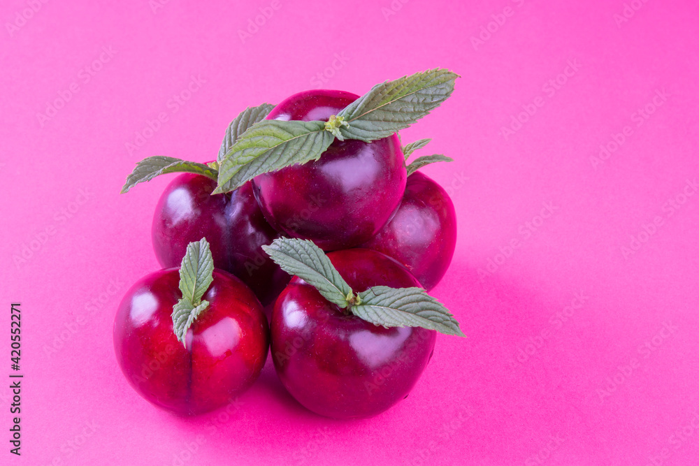 Healthy fruit and pink color concept: A group of purple red tropical plums with green leaves. Natural food background in fuchsia color with copy space
