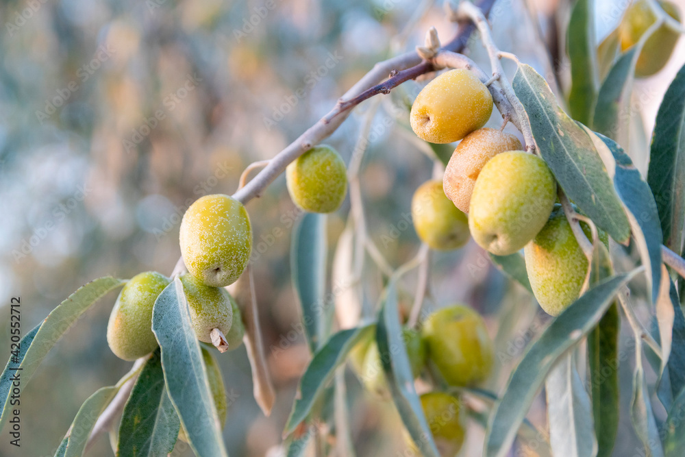 Selective focus on silver berries hanging on a tree with leaves. Natural sky and tree background with shallow depth of field