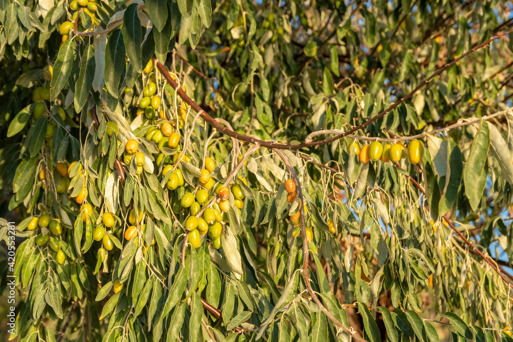 Selective focus on silver berries hanging on a tree with leaves. Natural sky and tree background with shallow depth of field