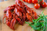 Boiled red crayfish lie on a wooden table, fresh herbs and tomatoes.Concept:beer appetizer, delicacy, crayfish meat.
