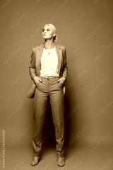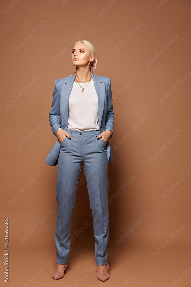 A young woman in a trendy blue suit, white blouse and beige shoes posing over beige background with copy space. Concept of business fashion and beauty