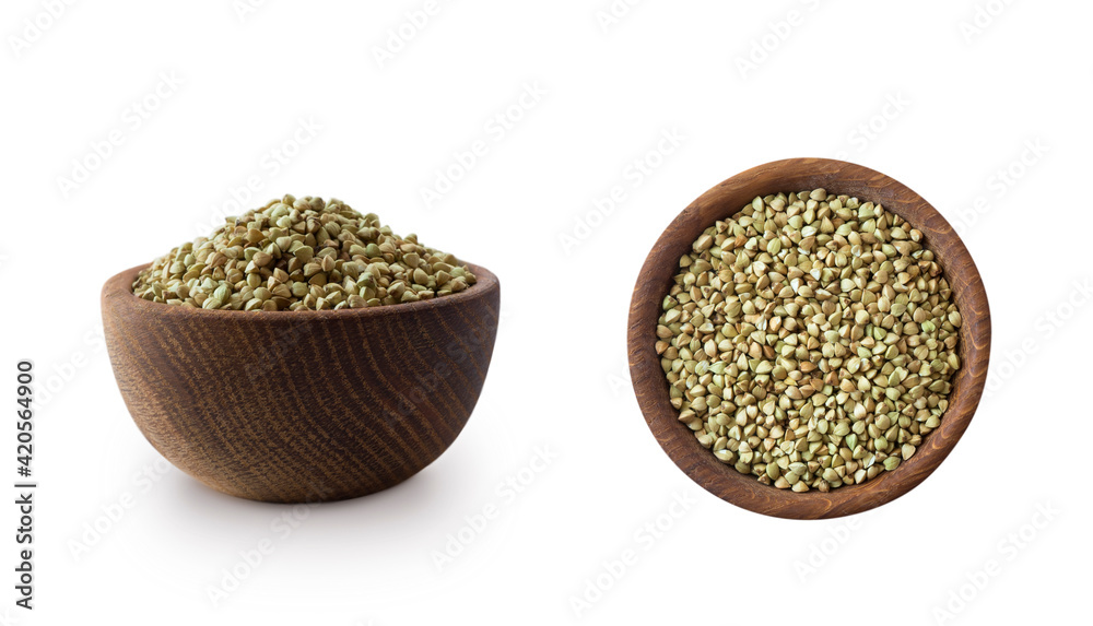 Wooden bowl with green buckwheat isolated on white background. Close-up. Green buckwheat groats Isolated on white. Green buckwheat in different angles. Image with copy space for text. Superfood.