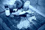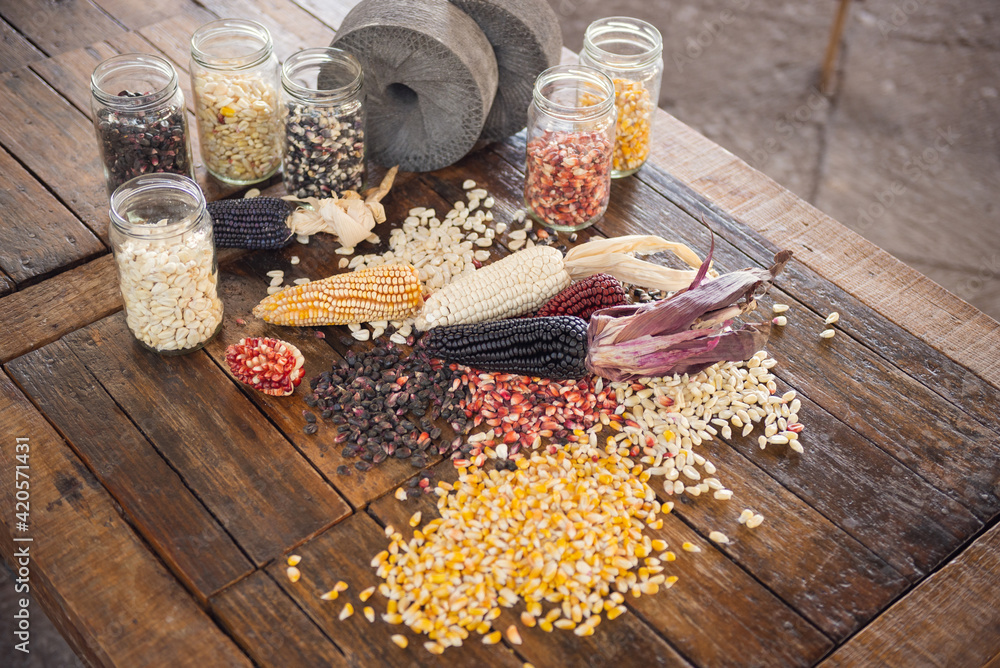Different species and colors of corn on wooden table. Corn for tortillas on wooden table. Mexican food.