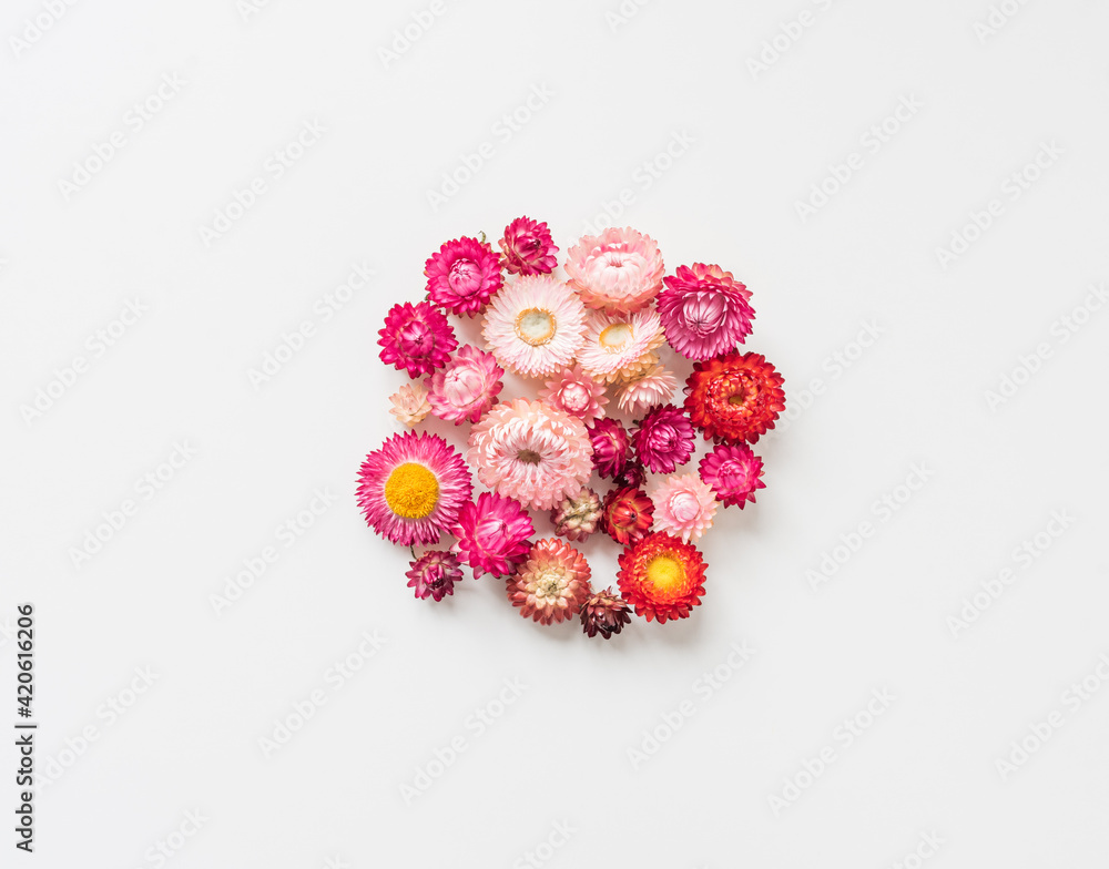 High angle view of pink and red strawflowers (everlasting paper daisies) on white background