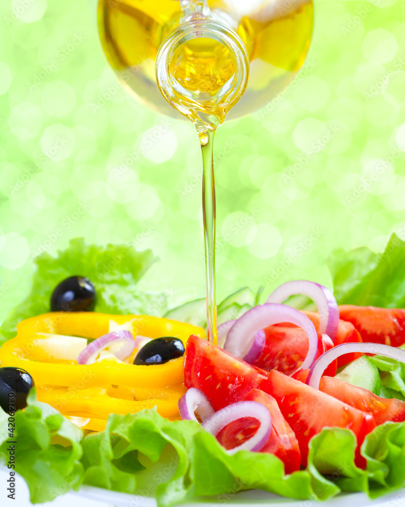 Healthy lifestyle. Fresh salad with oil. Food still life.