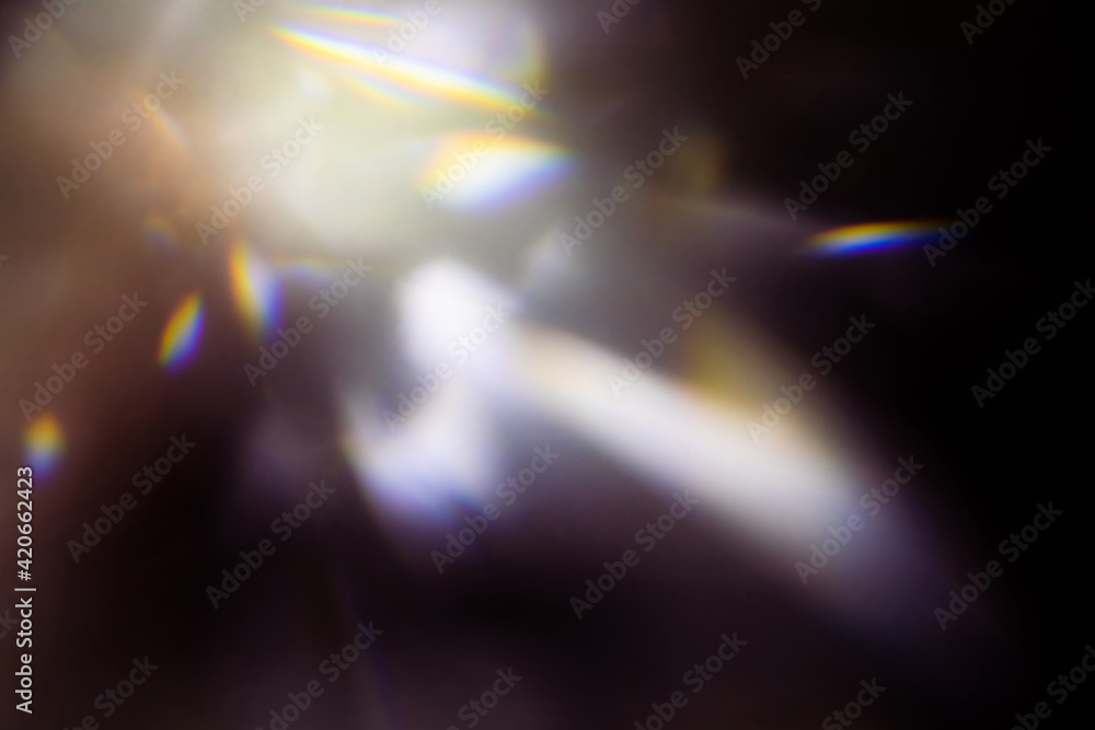 Blur colorful warm rainbow light leaks on black background with dust texture. Defocused abstract damaged scratched retro film analog effect for using over photos as overlay or screen filter
