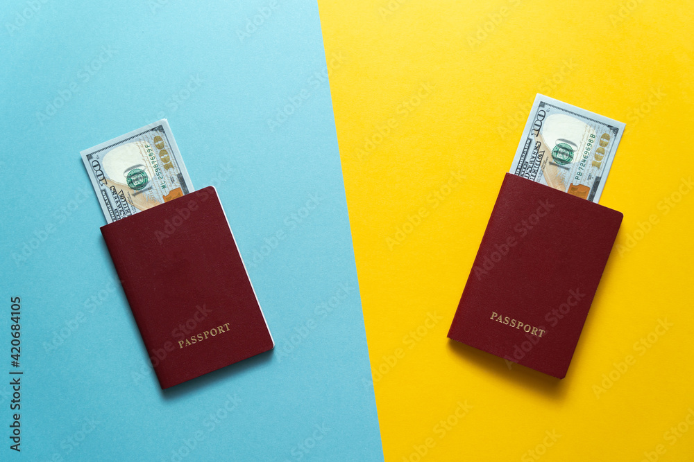 Passports with banknotes of 100 dollars on a blue and yellow background. The concept of equality between men and women.