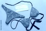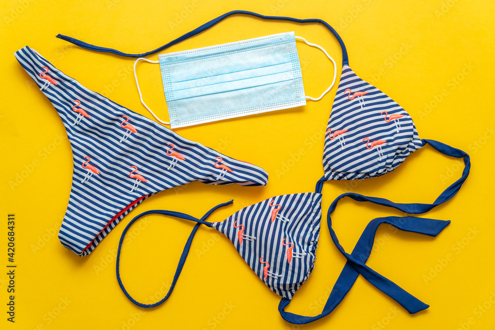 Women's swimsuit and medical mask on a yellow background. Traveling by sea during the coronavirus pandemic concept.