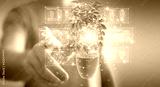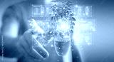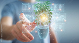 Man holding and touching holographic projection of a plant with digital analysis 3D rendering