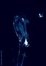 Dressage sportive blsck horse with classic bridle in dark stable