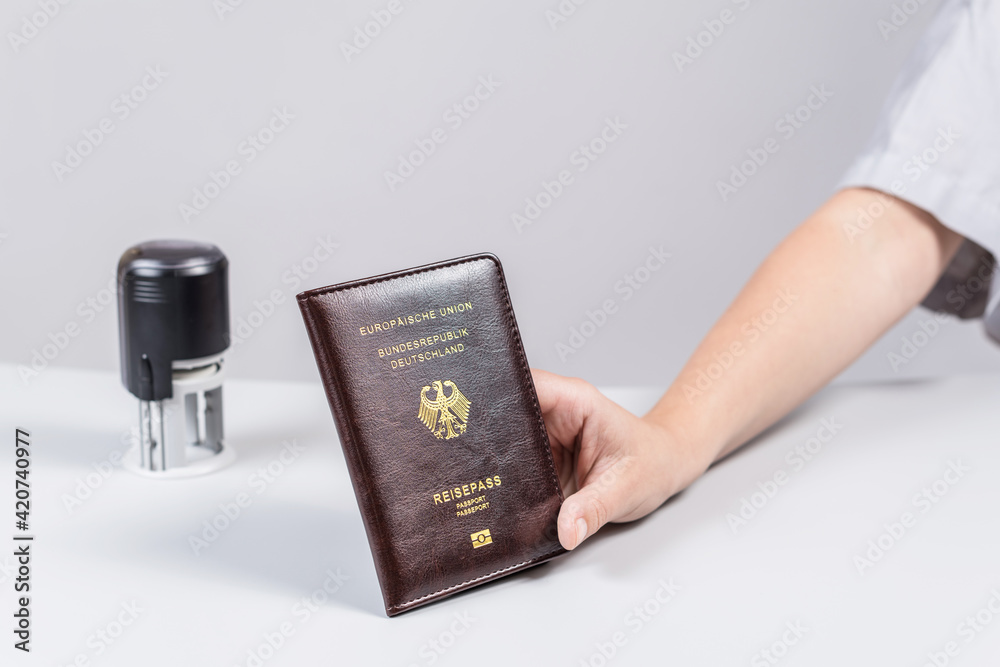 Immigration and passport control at the airport. Border control. Stamp in the German passport of citizen. Concept