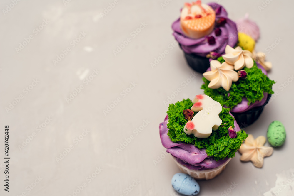 Easter food concept. Idea for kids. Decorating Easter bunny cupcakes with meringues