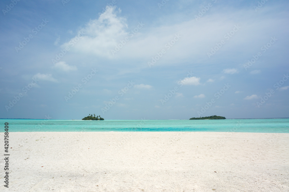 Uninhabited tropical island with palm trees. empty space with beautiful turquoise lagoon