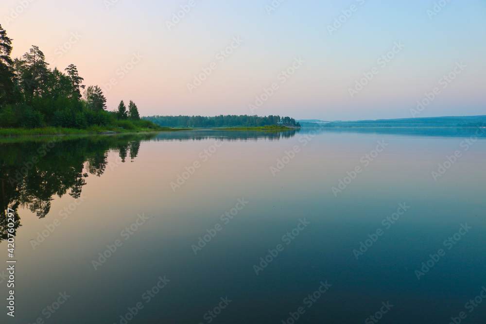 Early morning, calm water surface, fog over the lake. Summer landscape. Argazinskoe reservoir, Chelyabinsk, Russia