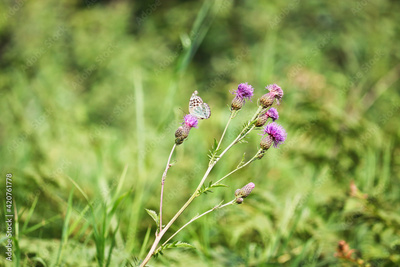 A silver-washed fritillary butterfly (Argynnis paphia) sits on a greater knapweed flower (Centaurea scabiosa) and drinks nectar with its proboscis. Selective focus.