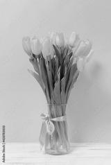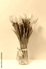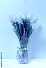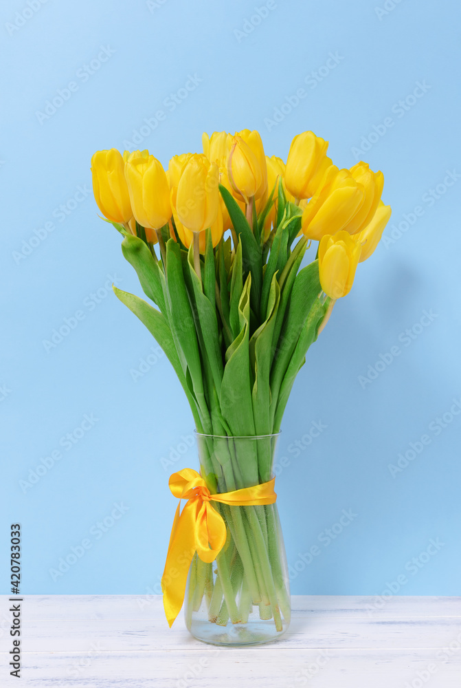 yellow tulips in a vase with a ribbon on a blue background, flowers