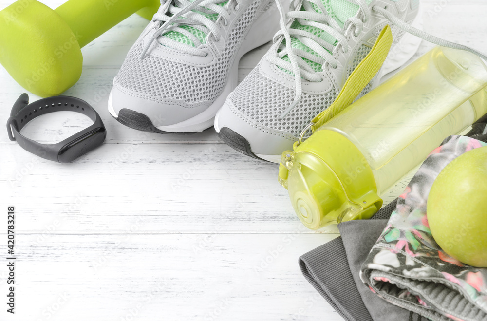 sneakers, green dumbbells, water bottle, sportswear on a white wooden background