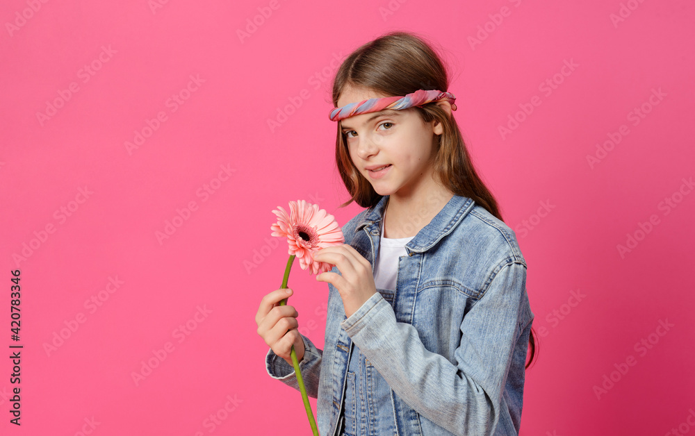 teenager, 1 white girl 10 years old in a denim shirt with a pink gerbera flower in her hands on a pink