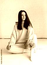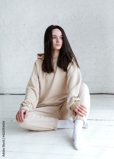 European brunette girl in a sportswear on a white wooden floor