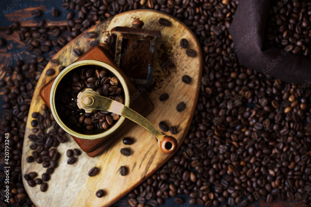 Manual authentic coffee grinder, freshly ground coffee on a wooden board on the table, a bag of coffee beans among the coffee beans scattered on the table, dark photo