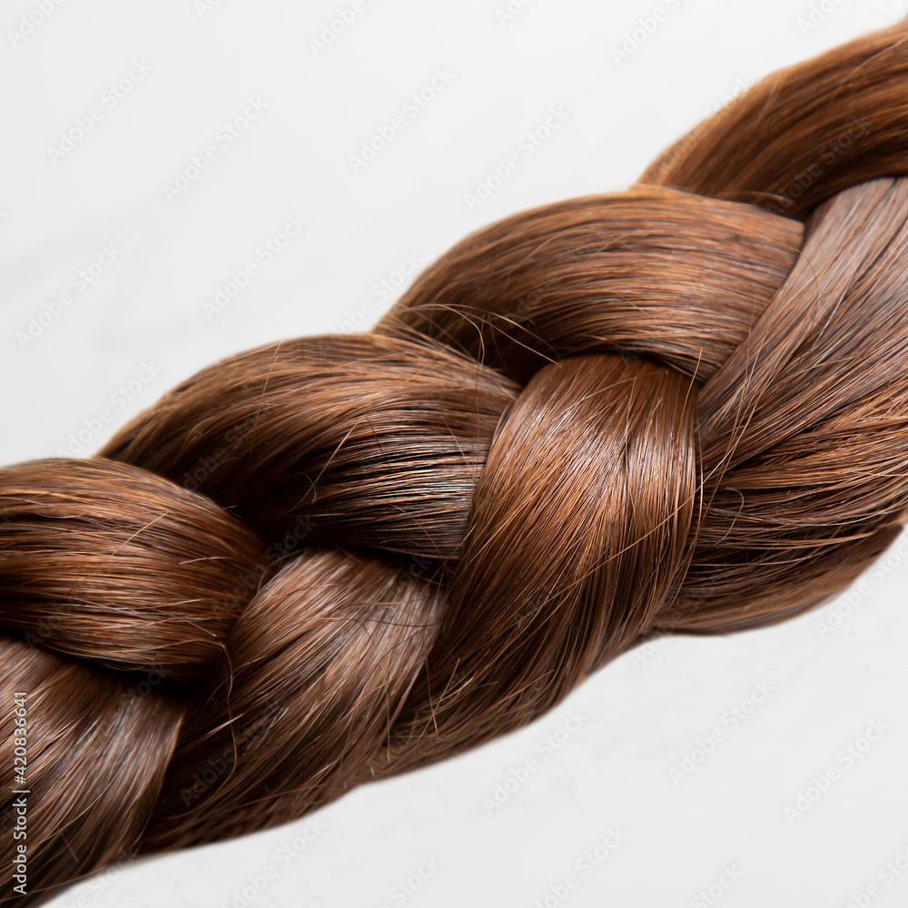 A girl's pigtail of dark brown hair. On a white background. Women's hair is braided in a braid. At close range. Hair style. Hair care.