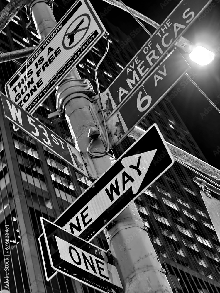 Yellow taxis driving down the street isolated on black and white view of New York City NYC